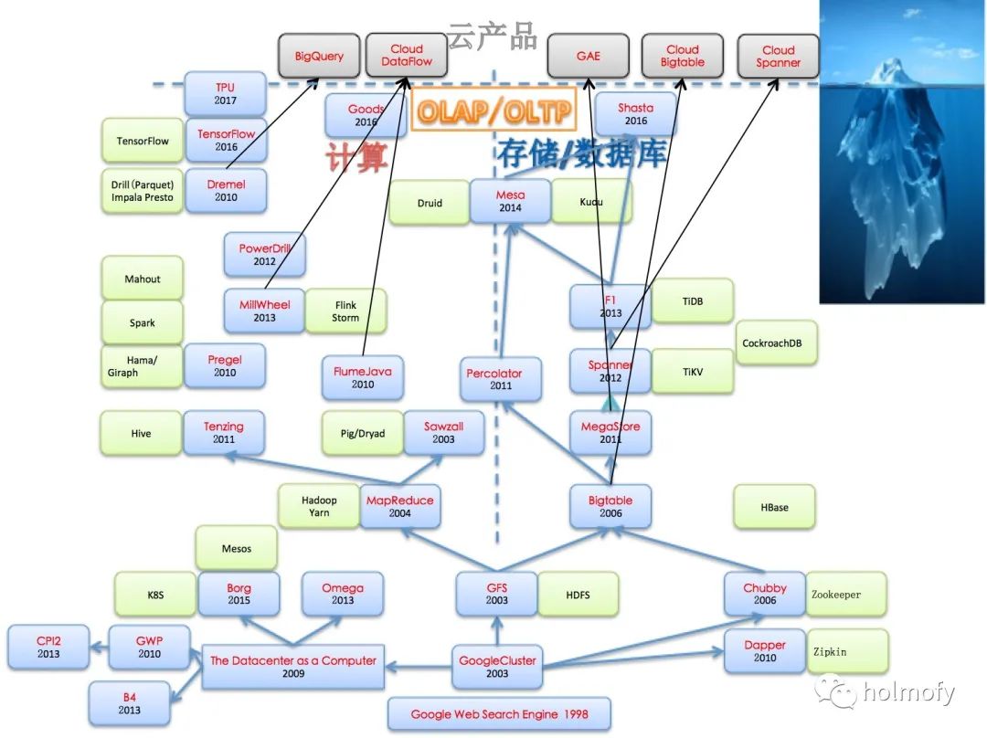 这其中每一篇论文都曾掀起过层层巨浪,比如号称三驾马车的GFS、MapReduce、Bigtable开创了大数据时代,Spanner、F1给分布式数据库指明了方向,TensorFlow引领了人工智能机器学习的发展,Borg衍生出基于K8S云原生的大生态。而Dapper也只是谷歌浩瀚冰山下的一隅,却引领了分布式系统链路追踪的发展。