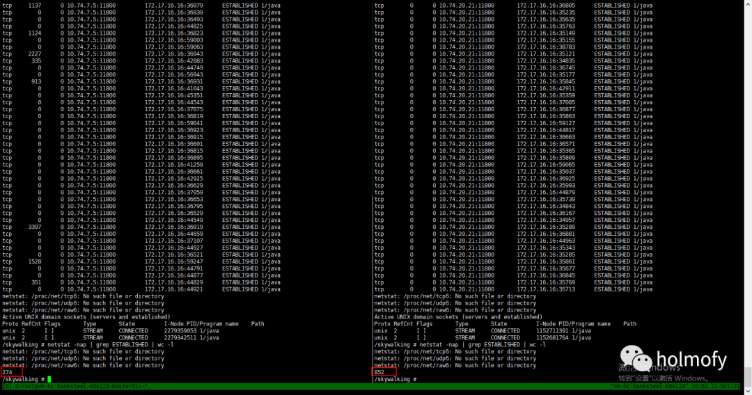 观察线上的两台oap发现,两台server都维持了大量的长连接,其中负载高的一台明显连接数更多。