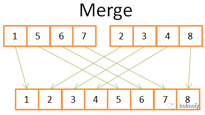上图最终获得一个排好序的具有 8 个元素的数组,你只需要遍历两个 4 元素的数组一次。由于两个 4 元素的数组都已经排好序了: