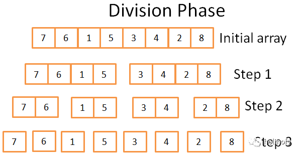 在分割阶段,使用3步,将原始数组分成只有一个元素的单元数组。这一步骤的是 log(N)(本例中,N=8,log(N) = 3)。