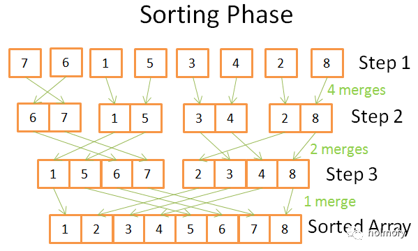 在排序阶段,你从单元数组开始。每一步都要应用多次合并,总的合并是 N=8 次: