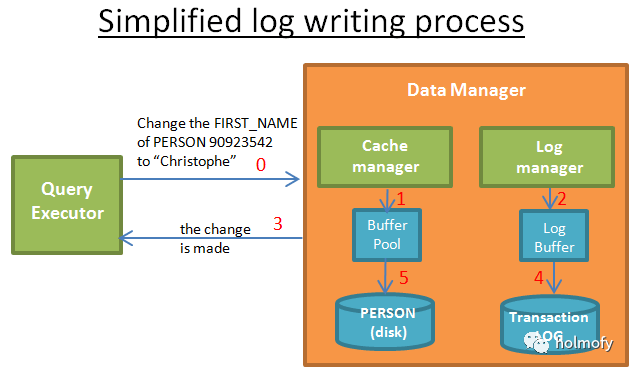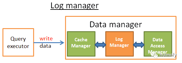 这个工作是由日志管理器完成的。简单来说,日志管理器就是,在缓存管理器和数据访问管理器(数据访问管理器将数据写入磁盘)之间,在数据写入磁盘之前,将每一个更新/删除/创建/提交/回滚写入事务日志。很简单,是不是?