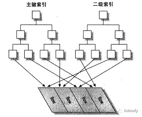 比如MySQL的MyISAM引擎就是非聚簇索引,MyISAM会把数据存在一个heap文件中(后缀名为.MYD),创建的B+树索引存在另一个索引文件中(后缀名为.MYI)。