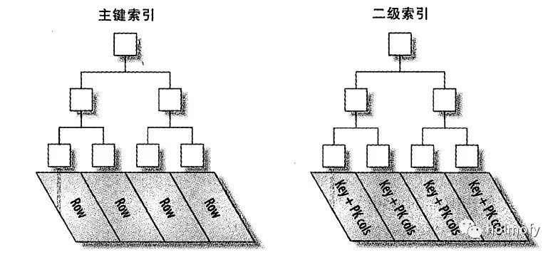 使用聚簇索引时,通过二级索引查找需要回主键索引再查一次B+树才能拿到完整的数据行;而非聚簇索引的二级索引和主键索引性能一样,可以直接访问堆文件中的数据行。