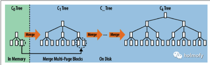 这里面除了内存中的C0树,其他写入到磁盘的C1...C2树都是不可变的。当磁盘中的C1树数量达到一定阈值,会有后台Merge线程会用类似于MergeSort的算法将多个C1树Merge成更大的C2树,同样当C2树数量达到一定阈值,也会Merge成更大的C3树... Merge的过程中会将相同key的老数据合并(compact)掉。