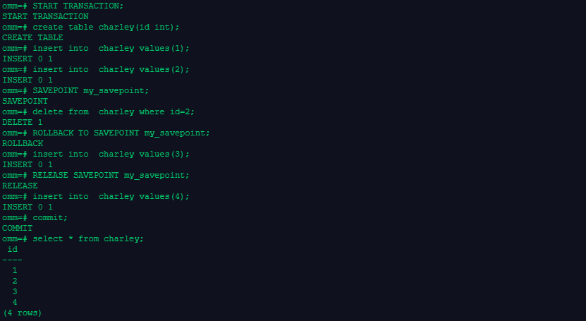 START TRANSACTION;create table charley(id int);insert into charley values(1);insert into charley values(2);SAVEPOINT my_savepoint;delete from charley where id=2;ROLLBACK TO SAVEPOINT my_savepoint;insert into charley values(3);RELEASE SAVEPOINT my_savepoint; insert into charley values(4);commit;select * from charley;