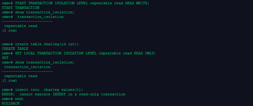 START TRANSACTION ISOLATION LEVEL repeatable read READ WRITE;show transaction_isolation;SET LOCAL TRANSACTION ISOLATION LEVEL repeatable read READ ONLY;show transaction_isolation;insert into charley values(1);end;