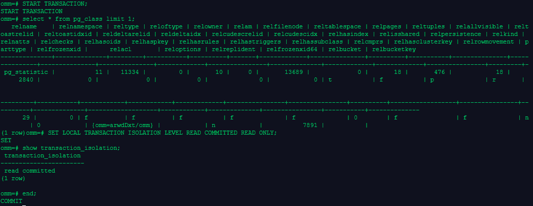 START TRANSACTION; select * from pg_class limit 1; SET LOCAL TRANSACTION ISOLATION LEVEL READ COMMITTED READ ONLY; show transaction_isolation; end;
