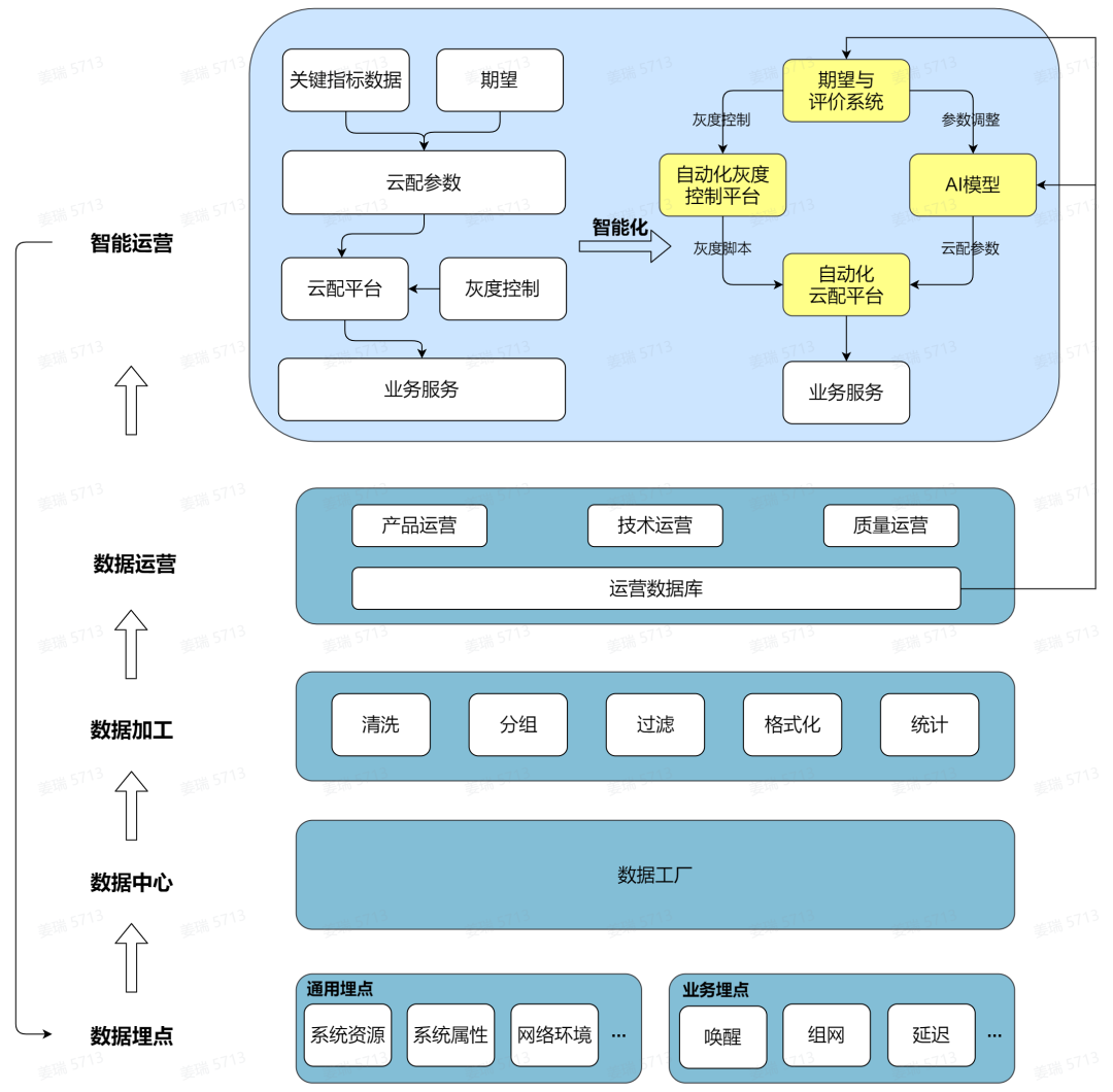 智能运营两个比较关键的服务:AI模型和期望与评价系统。AI模型根据大数据生成通用参数,然后结合每个用户的环境和行为的建模数据,生成定制化的参数,并通过自动化云配平台和灰度控制策略下发到设备端做AB测试。期望与评价系统会对AB测试的结果进行评估,如果不理想,则重新调整参数,输出到AI模型,并产生新的云配参数下发;如果评估可行,则启用下发给设备端的最新参数;通过这种方式不断循环迭代,达到预先设定的期望。