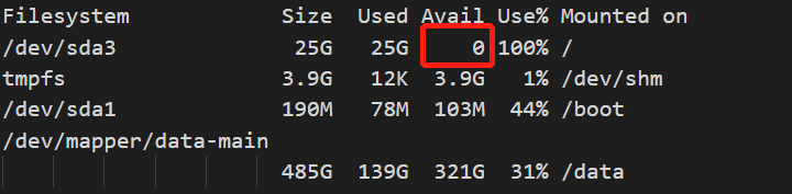 发现所在的/tmp目录却没有空间异常的情况,而相反是根目录的空间使用出现了异常,这是测试中截取到的一个空间异常的截图。