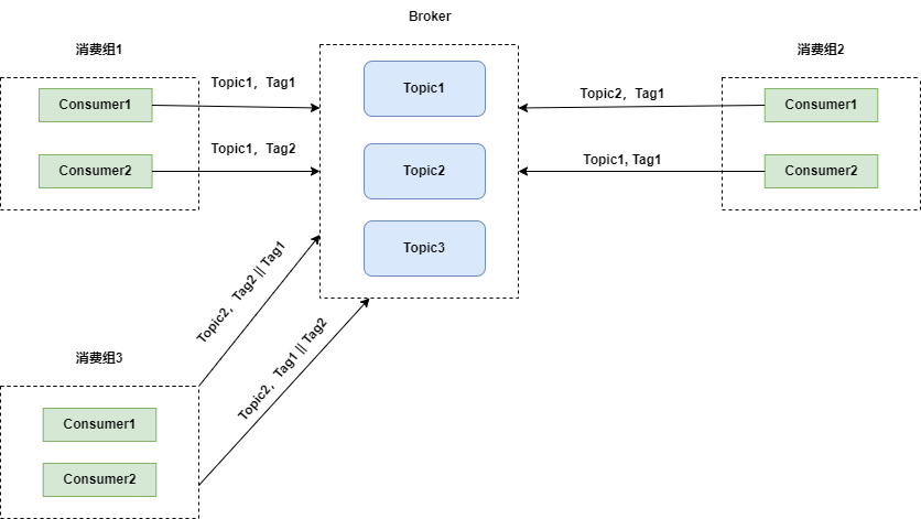 消费组 1 的 Consumer1 和 Consumer2 都订阅了 Topic1,但是订阅的 Tag 不一致。