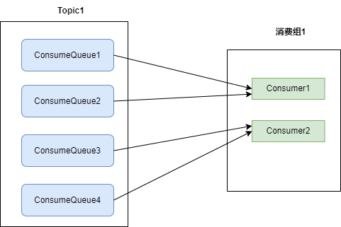 消费组 1 消费 Topic1 中的消息时,Consumer1 通过 ConsumeQueue1 和 ConsumeQueue2 进行消费,Consumer2 通过 ConsumeQueue3 和 ConsumeQueue4 进行消费,如果 Consumer1 订阅了 Tag1, Consumer2 订阅了 Tag2,那 Consumer1 从 ConsumeQueue1 和 ConsumeQueue2 消费消息时,就会把 Tag2 中的消息过滤掉,这样即使 Consumer2 订阅了 Tag2,也不能消费到 ConsumeQueue1 和 ConsumeQueue2 里 Tag2 中的消息了。