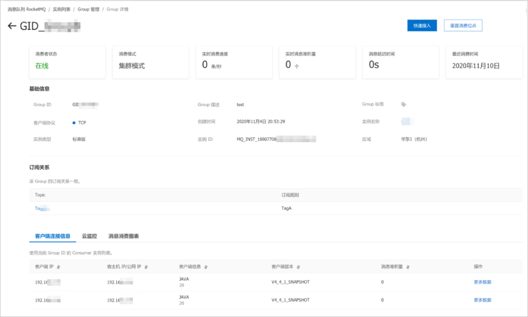 我:可以在 RocketMQ 的控制台看到。在 RocketMQ 的实例列表中,进入 Group 管理页面,查看要查找的 Group ID,查看详情,如下图:(下图来自阿里云)