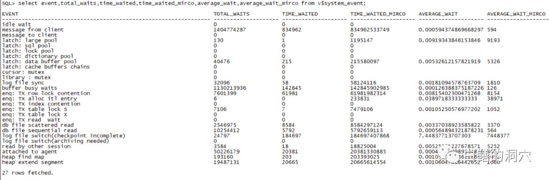 从上面的结果可以看到,目前高斯100提供了27个等待事件,这和Oracle数百个等待事件还是有一定差距的,不过这些等待事件大多数我们是经常使用的,因此对于我们分析数据库的整体健康情况也基本上够用了,起码是聊胜于无吧。分析一定时间段内的等待事件的次数与平均等待事件有助于我们了解数据库的整体健康与性能状况。