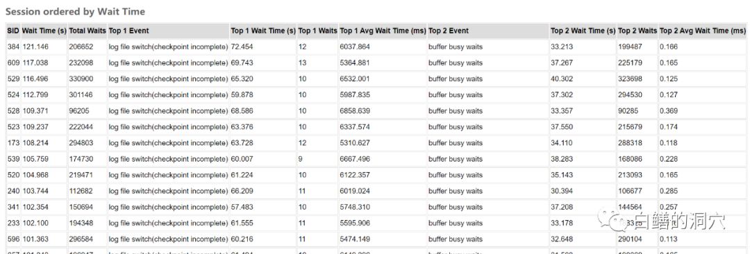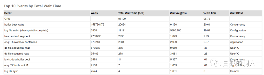 第三种使用等待事件的方法是通过WSR报告,这也是最为简单的一种方法,对于判断一定时间段内数据库的健康与性能状态是十分有价值的。
