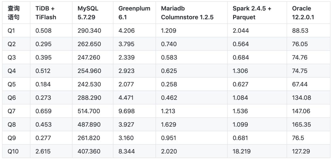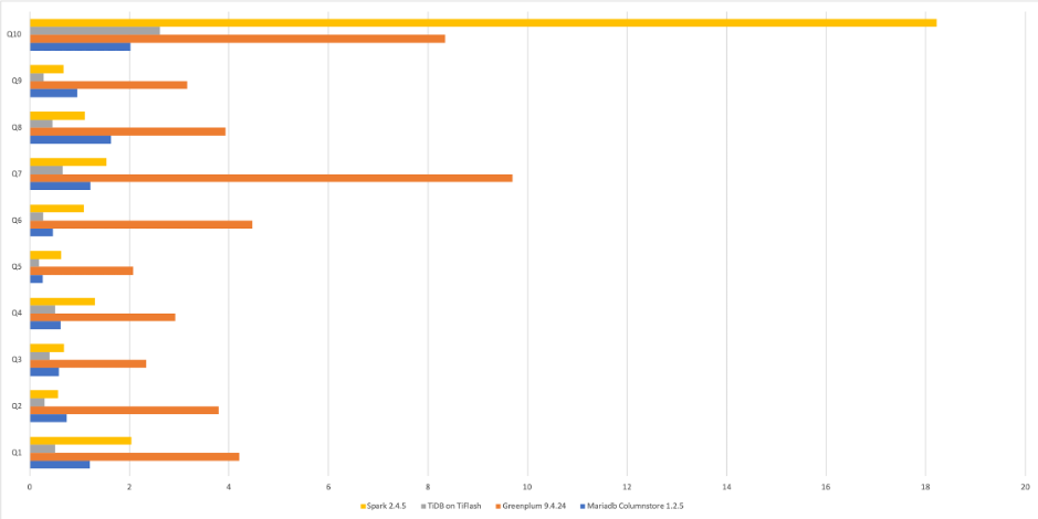 相对 MySQL 而言,单机环境下可达到数百倍提升(更不用提 TiFlash 可扩展); 而对比 MPP 数据库或者新 MariaDB ColumnStore 等无法实时更新的分析型数据库 引擎,仍然可达数倍乃至十倍的性能提升。