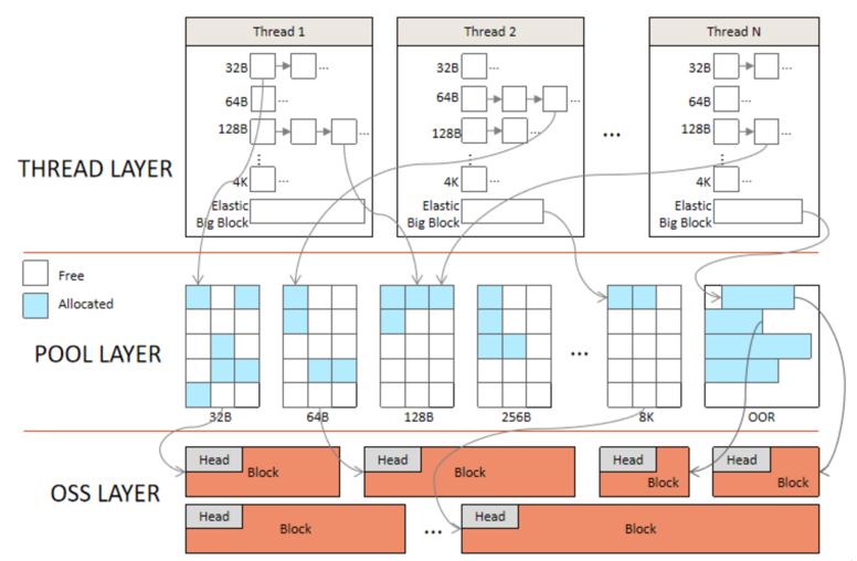 Pool Layer 是全局内存池,其中包含不同大小的段。段是从 OSS 层分配的连续内存块。每个段分为固定大小的块。默认情况下,有32字节,64、128…8092字节的块大小。超过8092字节最大块大小阈值的请求将由 OSS 层处理。
