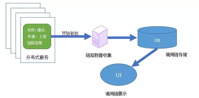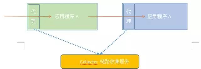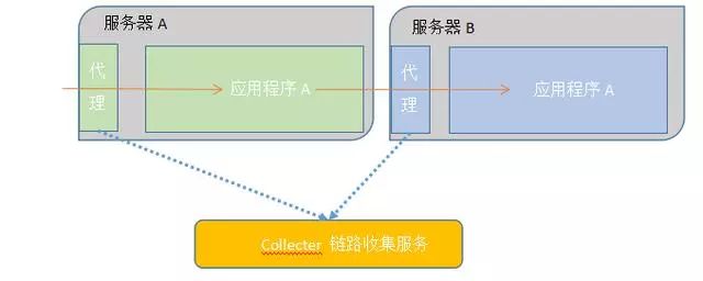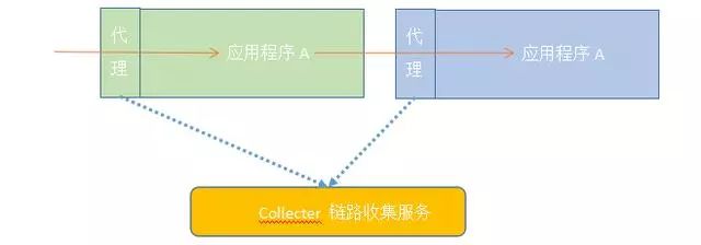 框架埋点。应用系统引入client端代码,应用请求会被Trace框架拦截,将调用链信息添加到Header中,并传递到后续的服务调用中,每次跳转都会传递调用信息,上报trace信息(时间戳、耗时等),server端的Collecter会汇总所有的跳转信息,合并成一条完整的调用链信息。