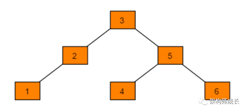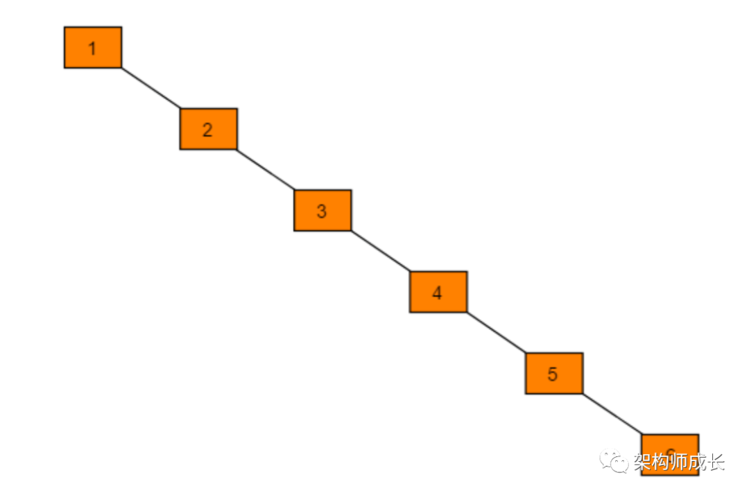 二叉搜索树一定程度上可以提高搜索效率,但是当原序列有序,例如序列A = {1,2,3,4,5,6},构造二叉搜索树如下图。依据此序列构造的二叉搜索树为右斜树,同时二叉树退化成单链表,搜索效率降低为O(n)。