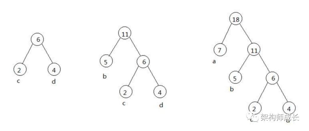 假设有a:7,b:5,c:2,d:4 总共4个节点,构造哈夫曼树的过程如下: