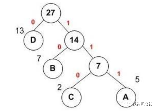 构造出霍夫曼树后,对霍夫曼树执行遍历。将向左子树路径标记为0,向右子树的路径标记为1。如下图: