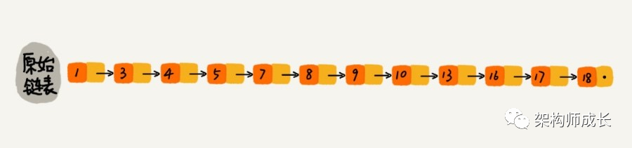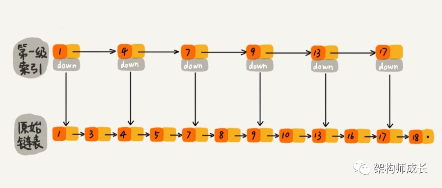 对初始链表做一层“索引”,每两个节点提取一个节点到上一层,然后用down指针连接到下一层。如下图:
