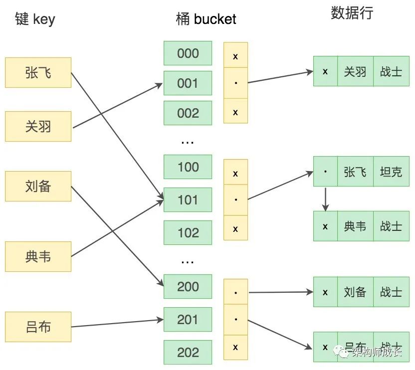 键值 key 通过 Hash 映射找到桶 bucket。在这里桶(bucket)指的是一个能存储一条或多条记录的存储单位。一个桶的结构包含了一个内存指针数组,桶中的每行数据都会指向下一行,形成链表结构,当遇到 Hash 冲突时,会在桶中进行键值的查找。