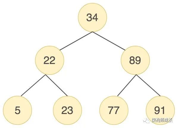 举个例子,我们对数列(34,22,89,5,23,77,91)创造出来的二分查找树如下图所示: