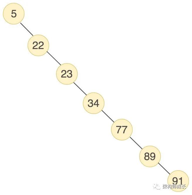但是存在特殊的情况,就是有时候二叉树的深度非常大。比如我们给出的数据顺序是 (5, 22, 23, 34, 77, 89, 91),创造出来的二叉搜索树如下图所示: