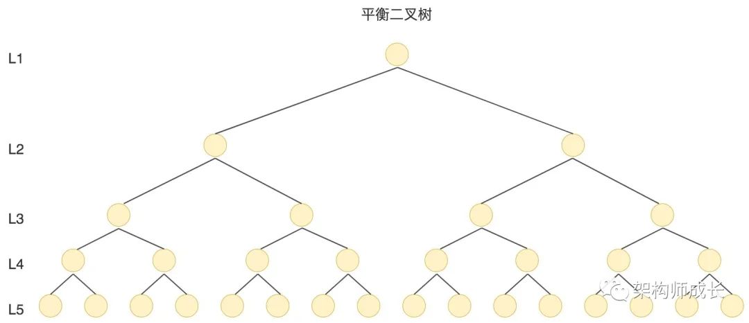 我们刚才提到过,数据查询的时间主要依赖于磁盘 I/O 的次数,如果我们采用二叉树的形式,即使通过平衡二叉搜索树进行了改进,树的深度也是 O(log2n),当 n 比较大时,深度也是比较高的,比如下图的情况: