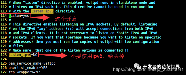 listen_ipv6=NO 含义与 listen 指令相同,只是在 IPv6 套接字上进行监听。该指令与 listen 是互斥的,不能同时使用。
