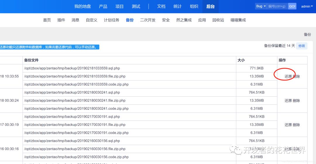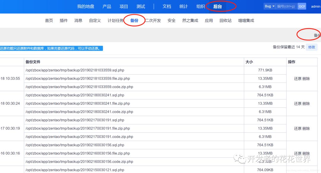 可以通用用上面的方式看看有没有历史备份文件夹,目录是zentao下的tmp/backup