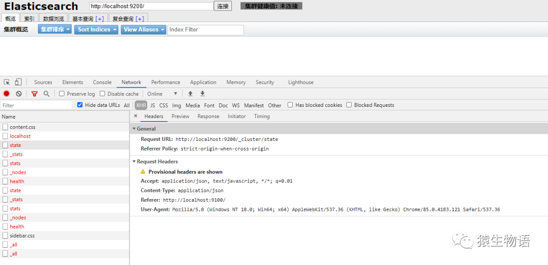 发现是跨域的问题。解决办法是在 elasticsearch 的 config 文件夹中的 elasticsearch.yml 中添加如下两行配置: