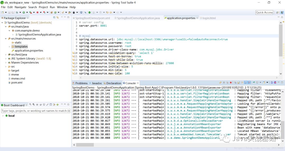 找到SpringBootDemoApplication类,Run As——Spring Boot App,项目启动成功,控制台不报错。