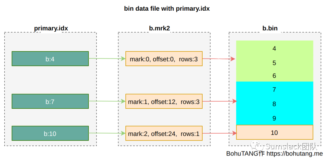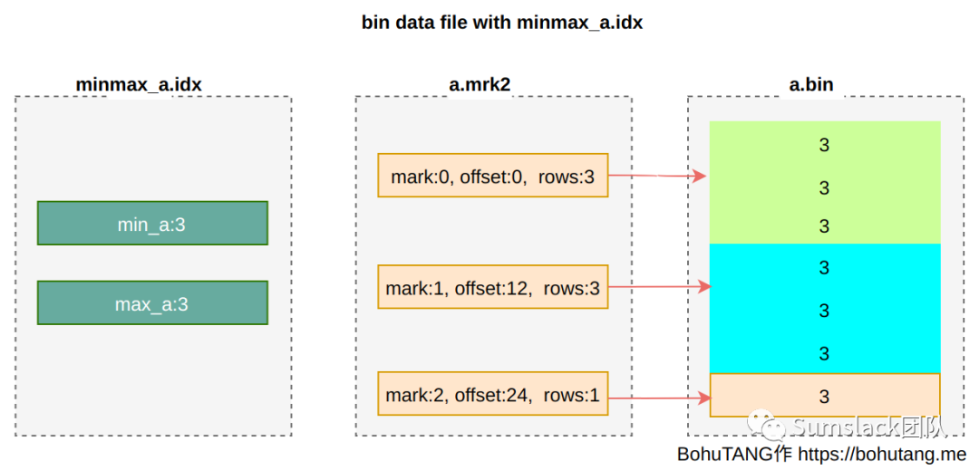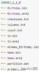 ls ckdatas/data/default/mt/3_6_6_0/a.bin a.mrk2 b.bin b.mrk2 c.bin checksums.txt c.mrk2 columns.txt count.txt minmax_a.idx partition.dat primary.idx skp_idx_idx_c.idx skp_idx_idx_c.mrk2*.bin 是列数据文件,按主键排序(ORDER BY),这里是按照字段 b 进行排序*.mrk2 mark 文件,目的是快速定位 bin 文件数据位置minmax_a.idx 分区键 min-max 索引文件,目的是加速分区键 a 查找primay.idx 主键索引文件,目的是加速主键 b 查找skp_idx_idx_c.* 字段 c 索引文件,目的是加速 c 的查找