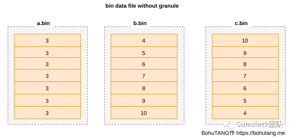 a.bin 是字段 a 的数据,b.bin 是字段 b 的数据,c.bin 是字段 c 的数据,也就是大家熟悉的列存储。