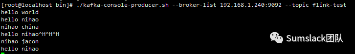 ./kafka-console-producer.sh --broker-list 192.168.1.x:9092 --topic flink-demo