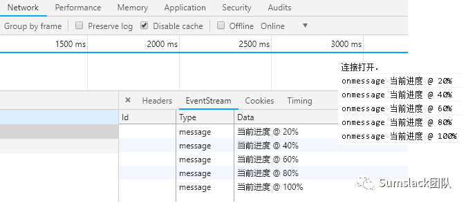 注:以上代码同时标注了消息ID,浏览器用lastEventId属性读取这个值。一旦连接断线,浏览器会发送一个 HTTP 头,里面包含一个特殊的Last-Event-ID头信息,将这个值发送回来,用来帮助服务器端重建连接。因此,这个头信息可以被视为一种同步机制。