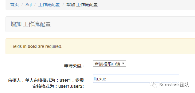 因为我们的SQL审查是需要一定工作流程,所以还需要在后台定义一个工作流,点击工作流配置,来新增加一个工作流(先liu审核,后xue审核):