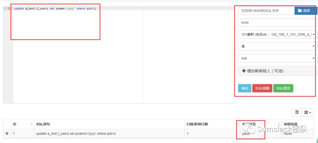 请注意:通过SQL检测按钮必须确保审核状态为pass才可以提交SQL,可选择是否要备份受影响的这些数据,一般选择是,以便回溯数据,选择好审核人后,提交SQL,此时SQL并为真正执行。