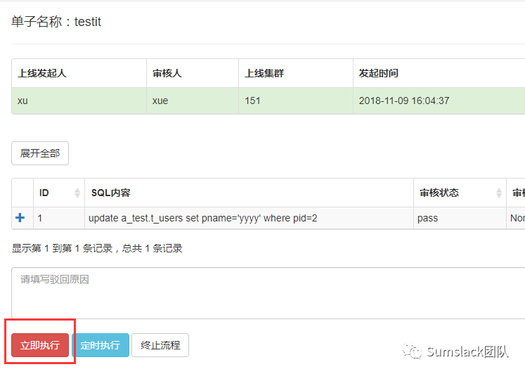 通过审核后,DBA角色的用户就可以执行这个SQL(如果单单是审核者身份的人是不能执行SQL的哦!)