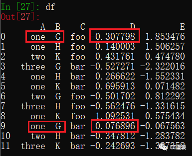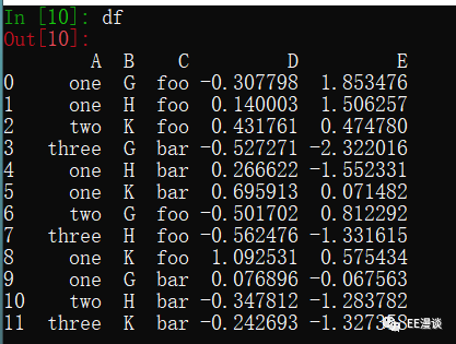 df = pd.DataFrame({'A': ['one', 'one', 'two', 'three'] * 3, 'B': ['G', 'H', 'K'] * 4, 'C': ['foo', 'foo', 'foo', 'bar', 'bar', 'bar'] * 2, 'D': np.random.randn(12), 'E': np.random.randn(12)})