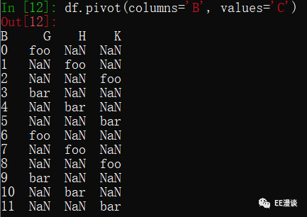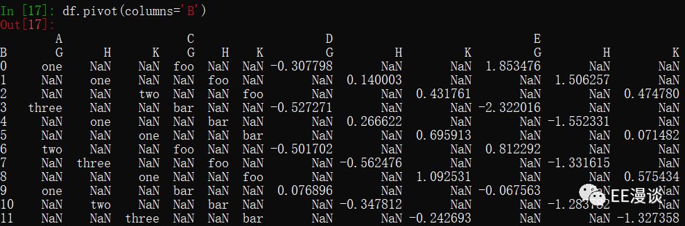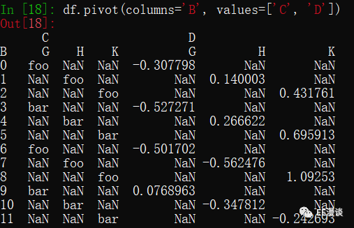 举例如下:df.pivot(index='A', columns='B', values='D')