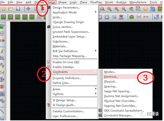 如果快捷图标里找不到,或者嫌图标太小不好找,看不见。那么你可以点击如下图所示的Setup---->Constraints---->Electrical,如下图所示: