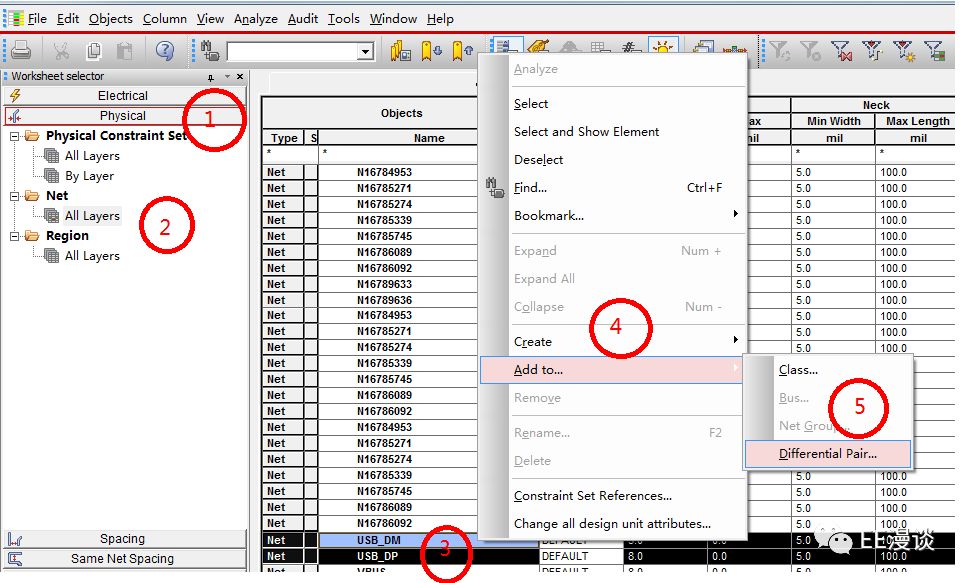 在弹出的约束管理器对话框中,依次点击Physical---->Net(All Layers)---->然后按住Ctrl键,选中需要设置为差分对的两个信号---->点击右键---->Add to---->Differentail Pair。如下图所示: