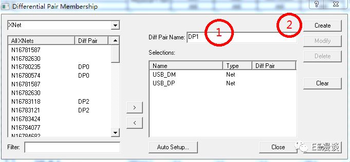 在Diff Pair Name对话框里给差分线对起个名字,点击Create后关闭对话框,差分对就创建成功!