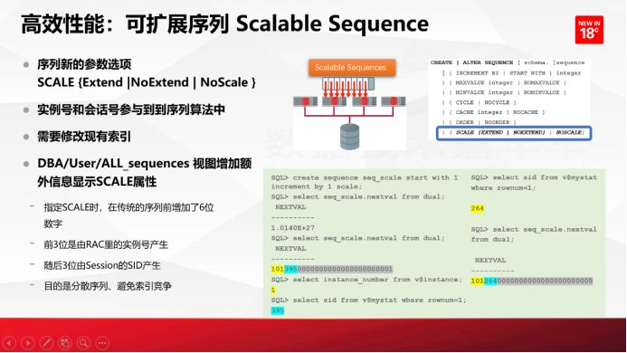 在Oracle中,一个频繁插入的系统在正常时刻的运行会非常稳定和高效,但是很可能突然会出现大量的竞争和等待,一般来说产生这个性能问题原因是单调递增索引在索引分裂的时候引发的竞争和等待。绝大部分主键依赖于SEQUENCE产生的NEXT_VALUE,而SEQUENCE产生的值一般都是单调递增的,因此序列产生的新值总是最大的,而索引本身又是一个排序的结构,当多个会话同时进行插入时,这些会话就会争抢索引叶子块的最右端,也就是最大值存放的地方。当索引需要进行分裂来扩展空间时,就会导致所有试图插入的会话被锁定,从而引发一系列并发等待,造成严重的性能问题。在18c中,一个重要的特性就是引入了Scalable Sequence。Oracle改造了序列的构成,其后半部分就是一个标准的序列,而前半部分分别把数据库的实例ID和当前会话的SESSION ID加到了序列中,因此在获取序列的NEXT_VALUE时,得到的不再是递增的数值,而且变化差异非常大的不连续的数值,从根本上改变了获取序列的数据连续性问题,解决了由此引发的索引热点块争抢的问题。