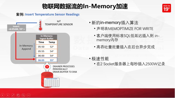 针对物联网应用场景,面临海量数据的频繁插入,Oracle提供了专门的优化手段:MEMOPTIMIZE FOR WRITE。开启表的这个功能后,前台业务插入直接写入LARGE POOL中的内存空间,后台进程异步的将内存中的数据写入到数据库文件中,其本质是以牺牲事务性为代价来换取极速的插入性能,在2 Socket服务器上可以实现每秒插入2500万条记录。在19c中Oracle对于在线维护操作进一步增加,进一步降低了DDL对于正在运行系统的影响。在进行游标过期时,将会采用更加智能的策略,将DML和SELECT按照不同的策略进行处理,采用滚动游标过期方式,避免DDL使得所有相关游标同时过期,从而导致解析风暴引发的并发锁定问题。在数据库中有一类SQL比较难以处理,被称为RUNAWAY语句,这类语句有一个特点,执行次数并不频繁,但是会消耗大量的资源,一旦被执行就可能造成系统的性能问题。而且下次再运行的时候,可能在SQL文本上有少量的变化,导致难以通过SQL_ID的方式进行定位和处理。Oracle针对这种SQL提供了执行计划隔离的能力,评估一个SQL是否会被隔离不是根据SQL文本,而是根据SQL的执行计划,一旦SQL的消耗超过了资源管理器中的阈值设置,该SQL语句对应的执行计划就被隔离起来,后续所有采用同样执行计划的SQL都不会再被执行。从而有效地避免了RUNAWAY语句对于性能的影响。19c的ADG对DML的自动重定向功能也是比较引人关注的,在配置了该功能后,在备库上运行的DML会被Oracle通过内部DBLINK传输到主库中运行,运行成功后产生的日志发送到备库并成功应用后,备库上的DML才会成功返回,并可以查看到DML执行后的结果。