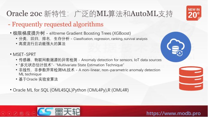 20c中Oracle内置了机器学习算法,比如极限梯度提升树,MSET-SPRT等。此外,这些机器学习的算法支持多种语言的支持,比如SQL、Python和R语言。