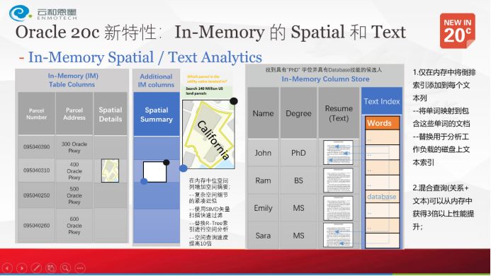 Oracle的In-Memory功能仅需一个参数就可以实现全自动化的管理,不在需要管理员手工指定表的方式。内置的自动算法会根据表的访问频繁情况,自动决定加载表或从IN-Memory内存中驱除表,还会自动对较少访问的数据进行压缩。Oracle的In-Memory功能不仅仅针对结构化数据,对于空间数据库和全文数据库,同样可以采用In-Memory来进行加速,从而获得几倍或更高的性能提升。在12.2和18c中,Oracle实现了ADG切换之后的连接会话保持和Buffer Cache的保持功能,在20c中,Oracle可以实现ADG中Result Cache缓存的保持功能,普通用户将很难察觉到Data Guard主备切换带来的影响。